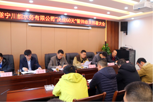 2019年11月25日下午,遂寧川能水務(wù)有限公司為確保春節(jié)前圓滿完成2019年工程建設(shè)目標(biāo)任務(wù),組織公司全體員工及各參建單位召開了決戰(zhàn)60天誓師動(dòng)員工作部署會(huì)。??