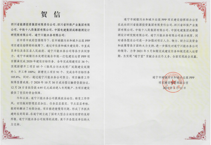 近日,遂寧川能水務(wù)公司收到遂寧市城鎮(zhèn)污水和城鄉(xiāng)垃圾PPP項(xiàng)目建設(shè)指揮部發(fā)來的賀信,指揮部對遂寧公司項(xiàng)目任務(wù)的落實(shí)、項(xiàng)目建設(shè)取得的成績向各股東單位表示祝賀。